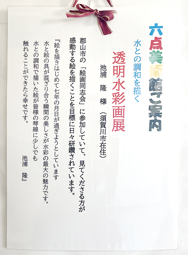 『絵を描きはじめて七年の月日が過ぎようとしています。水と絵の具が混ざり合う瞬間の美しさが水彩の最大の魅力です。水との調和で描いた絵が皆様の琴線に少しでも触れることができたら幸せです。  池浦 隆』