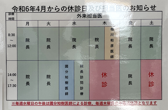 ◯毎週水曜日の午後は國分知樹医師による診察です。 ◯毎週木曜日の午後は休診となります。